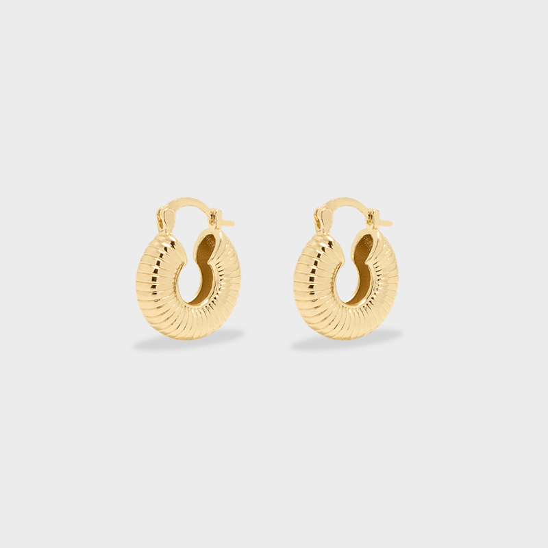 Diseño curvo, elegante y con carácter. Estas arracadas de chapa de oro destacan por su textura acanalada que aporta dimensión y brillo al instante. Compactas pero con presencia, son ideales para un look pulido tanto de día como de noche. Un básico con actitud para tu colección.