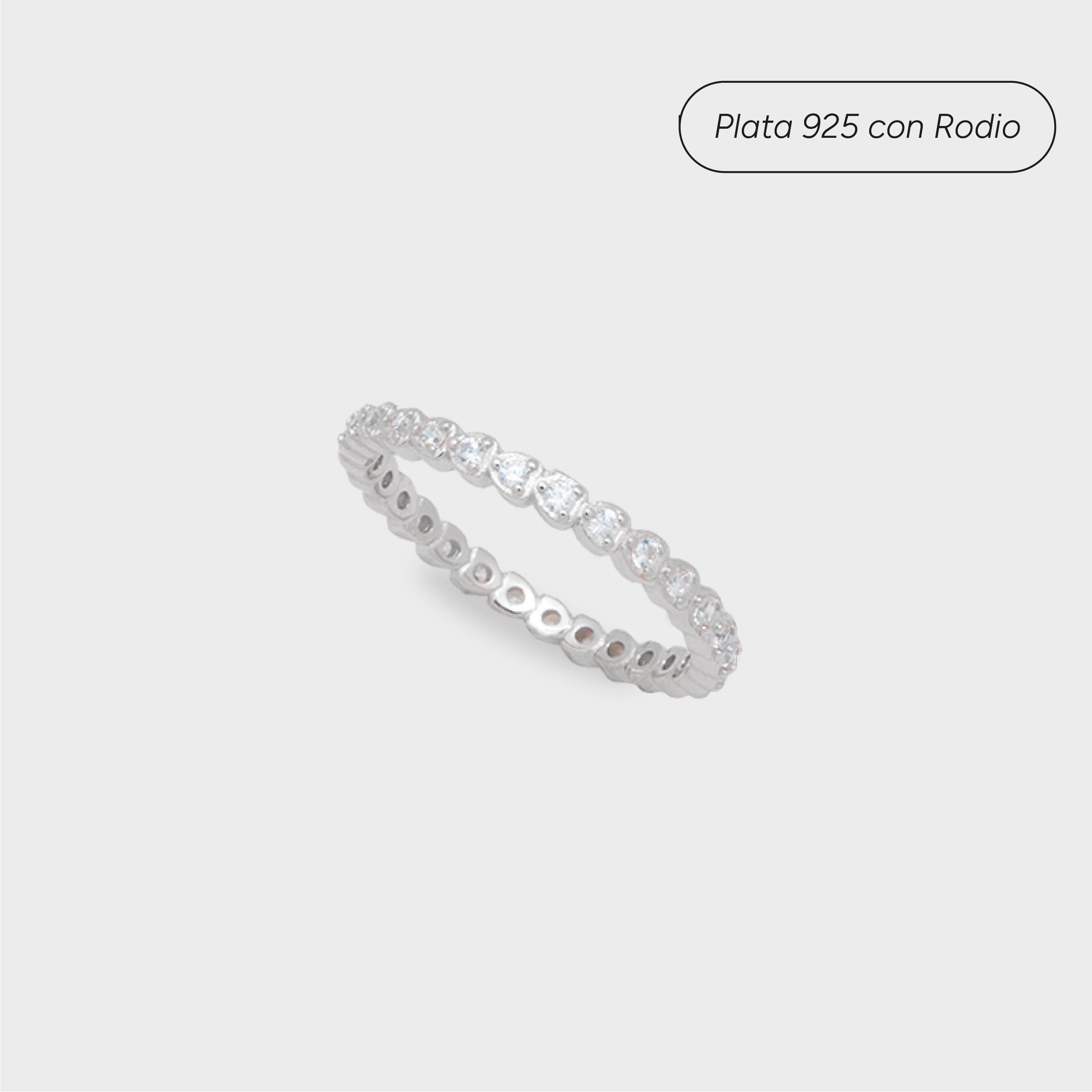 Material: Plata 925 con baño de rodio. Medidas: 0.2 cm de espesor (banda). Color: Plateado. Características: Eternity band con circones corte brillante engastados en todo el aro.