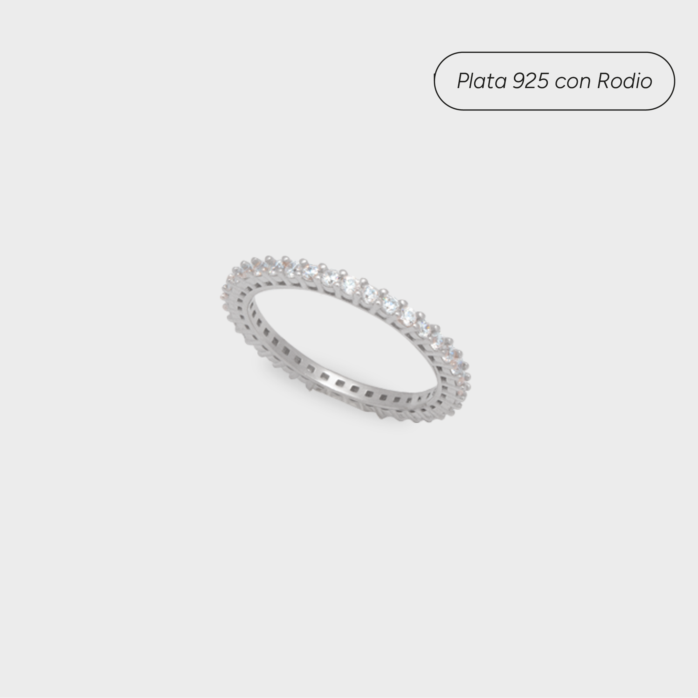 Material: Plata 925 con baño de rodio. Medidas: 0.2 cm de espesor (banda). Color: Plateado. Características: Anillo tipo churumbela / eternity band con engaste estilo shared prong.