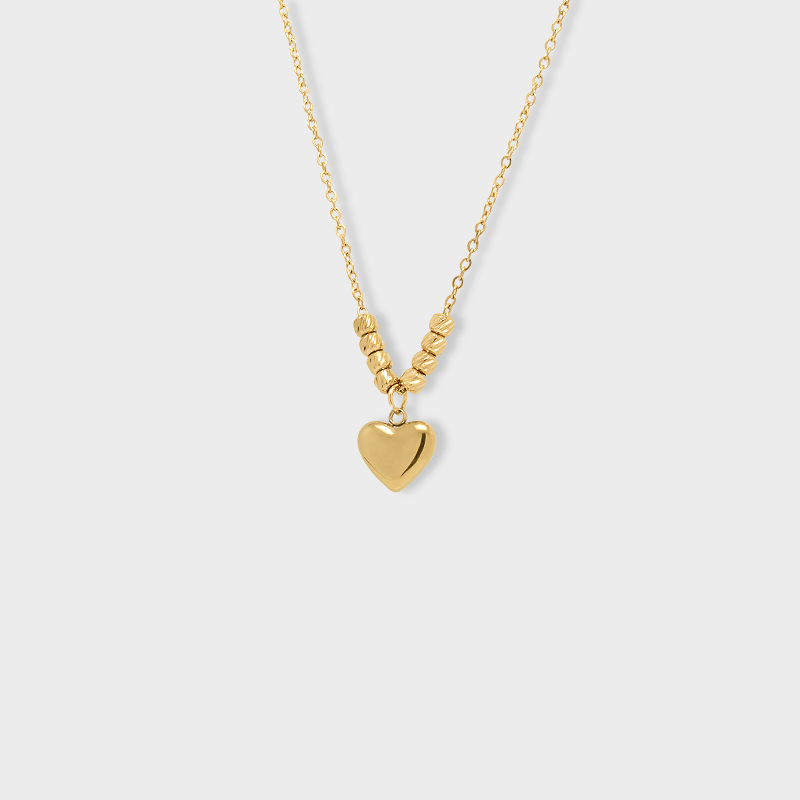 Un detalle dorado que lo dice todo. Esta cadena de acero inoxidable combina cuentas texturizadas con un dije de corazón liso que aporta brillo y ternura a cualquier look. Femenina, versátil y resistente al agua, es ideal para uso diario o para regalar con intención.