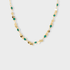 Este collar de chapa de oro combina pequeños circones de color verde esmeralda con discos dorados que captan la luz con cada movimiento. Su diseño es fresco, elegante y perfecto para usar en verano o como acento vibrante en tu día a día.