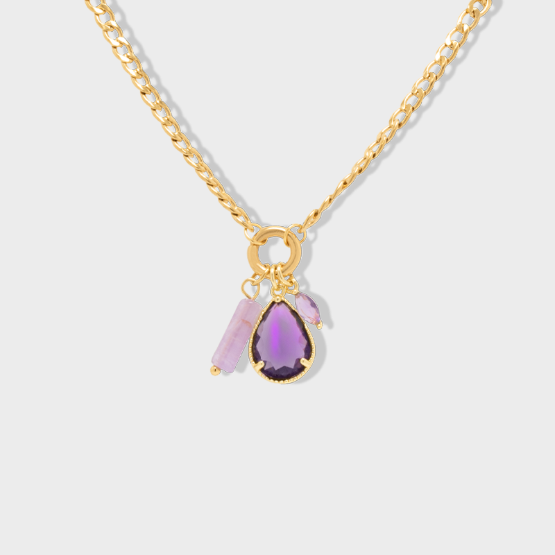 El collar Lilac Drop combina eslabones de acero inoxidable con baño dorado y un trío de dijes en tonos lavanda: un circon en forma de gota, una piedra facetada y un cilindro lila. Un diseño lleno de movimiento y color que resalta por su originalidad. Ideal para usar sola o como parte de un layering sutil. Resistente al agua y al paso del tiempo.