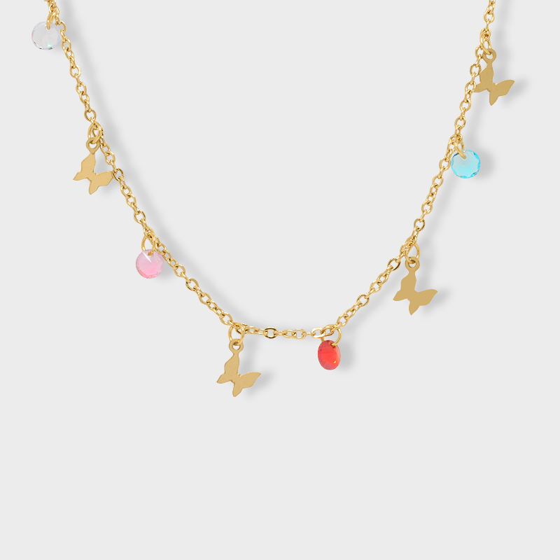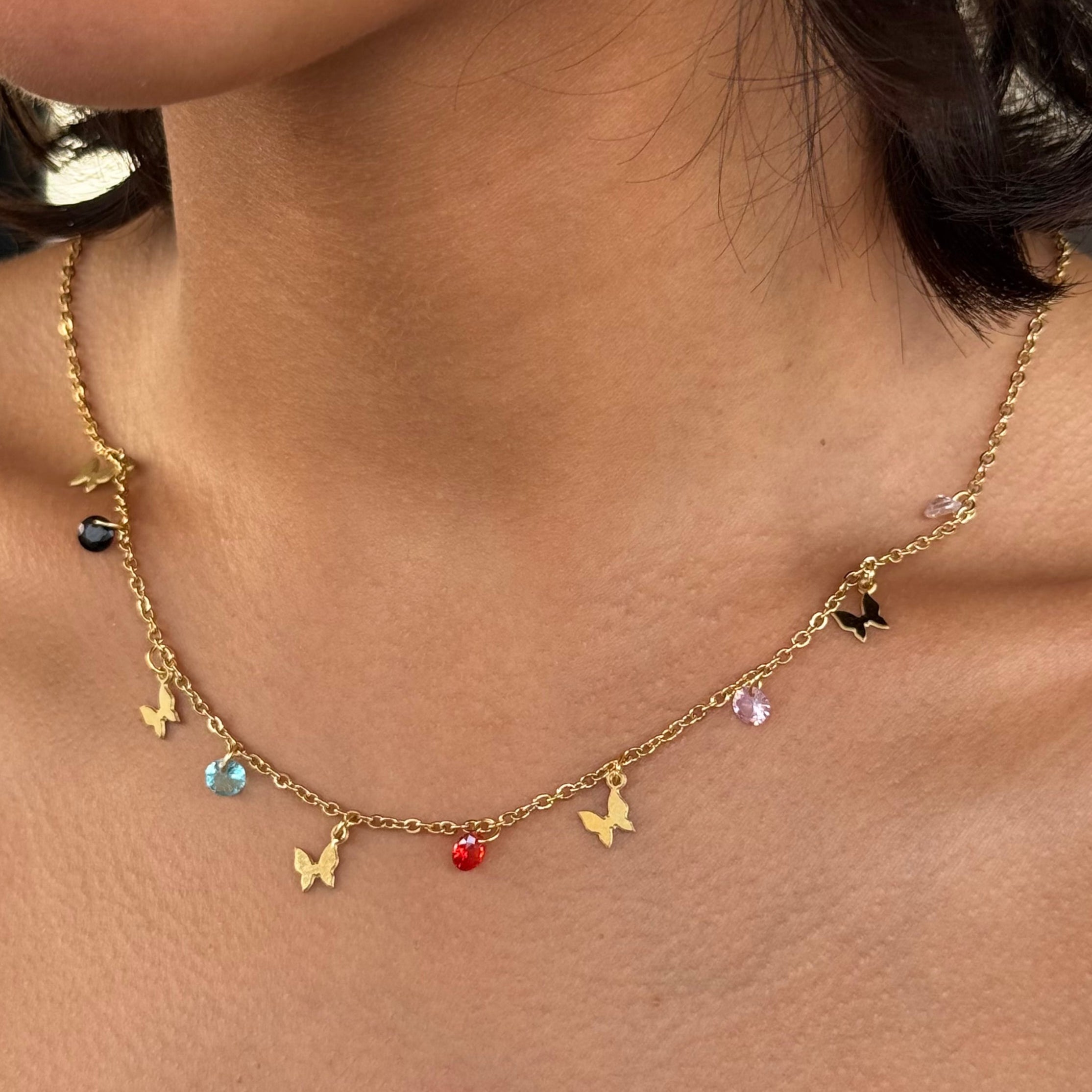 Este collar combina movimiento, color y ligereza en una sola pieza. Con dijes de mariposas doradas y circones en tonos vibrantes, esta cadena en acero inoxidable con acabado dorado es ideal para dar un toque divertido y femenino a cualquier look. Resistente al agua y al sudor, es perfecto para usar a diario sin perder brillo ni encanto.
