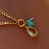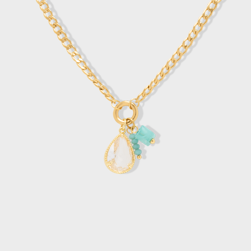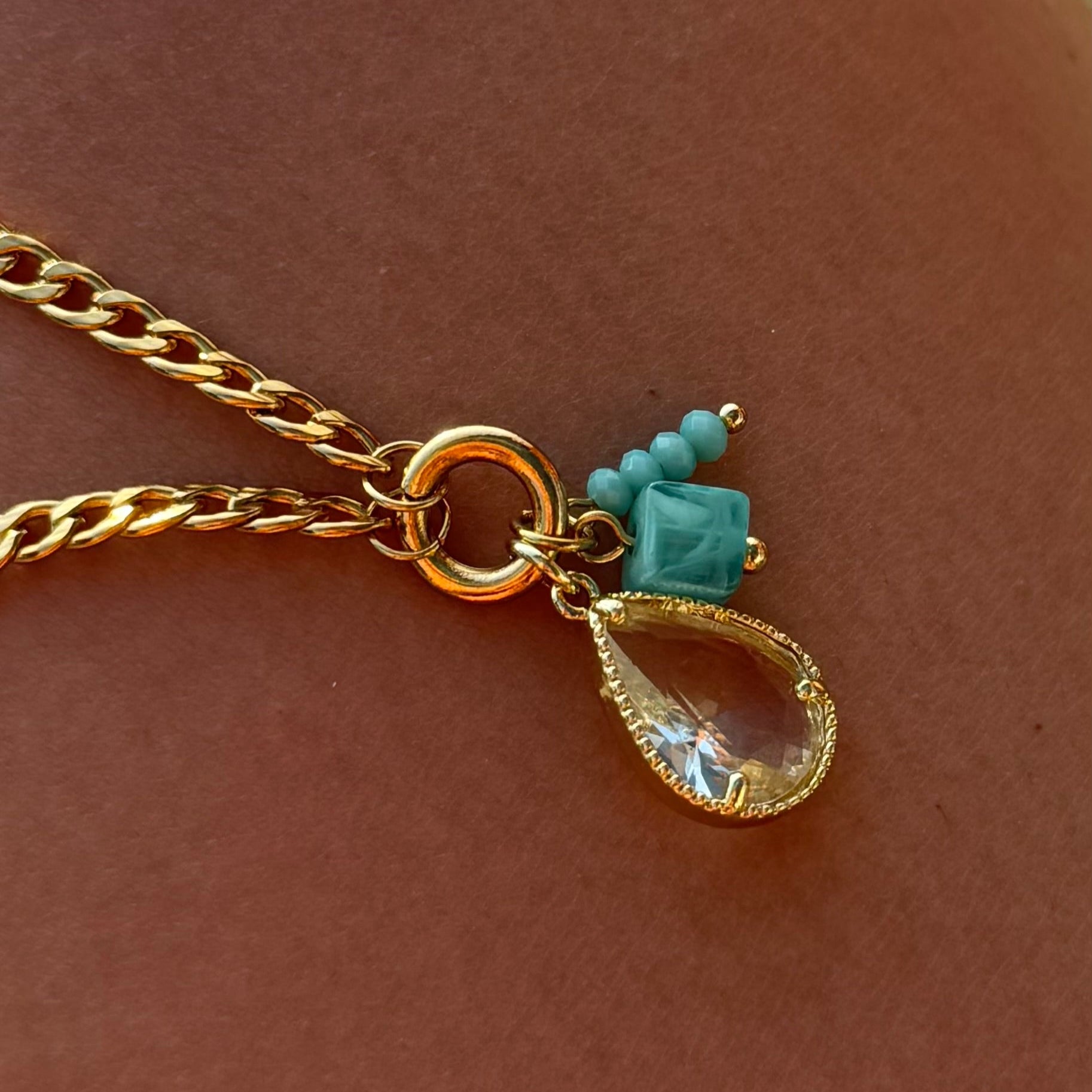 El collar Turquoise Drop está hecho de acero inoxidable con baño dorado y dijes en tonos turquesas: un circón tipo gota, cuentas en miniatura y una piedra cuadrada que evocan la transparencia y calma del mar. Perfecta para un look veraniego, relajado y femenino. Resistente al agua y diseñada para destacar sin esfuerzo.