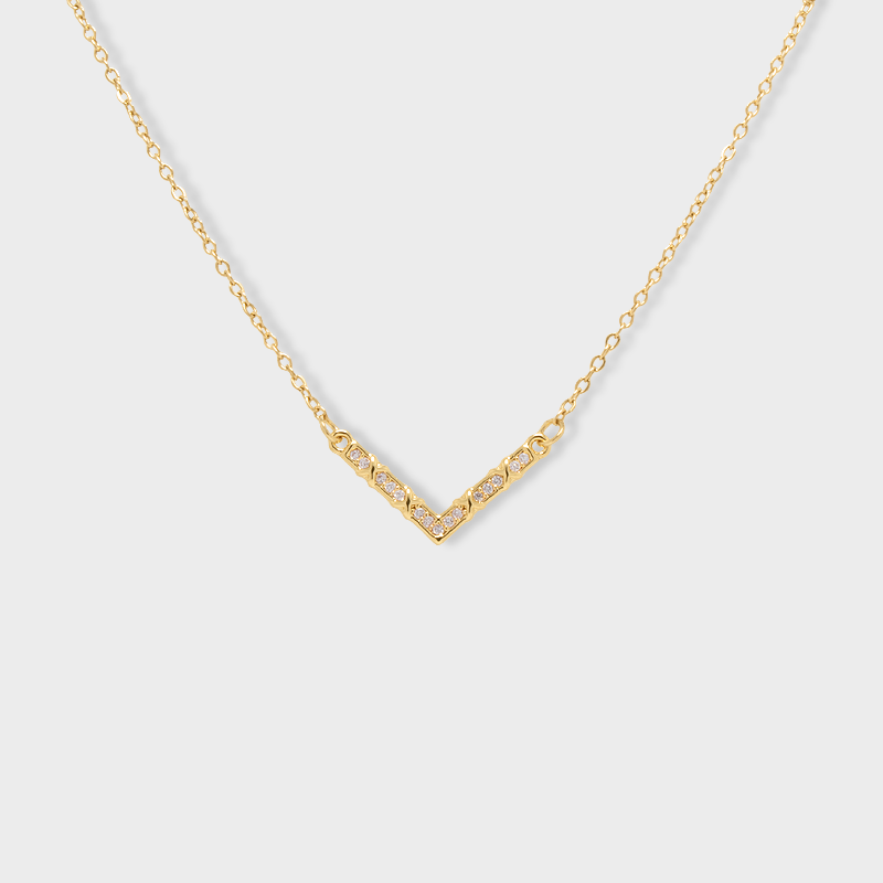 Esta cadena de acero inoxidable dorado tiene un dije en forma de V decorado con circones que atrapan la luz desde cualquier ángulo. Moderna, elegante y versátil, es ideal para elevar cualquier look sin perder la sutileza del minimalismo.