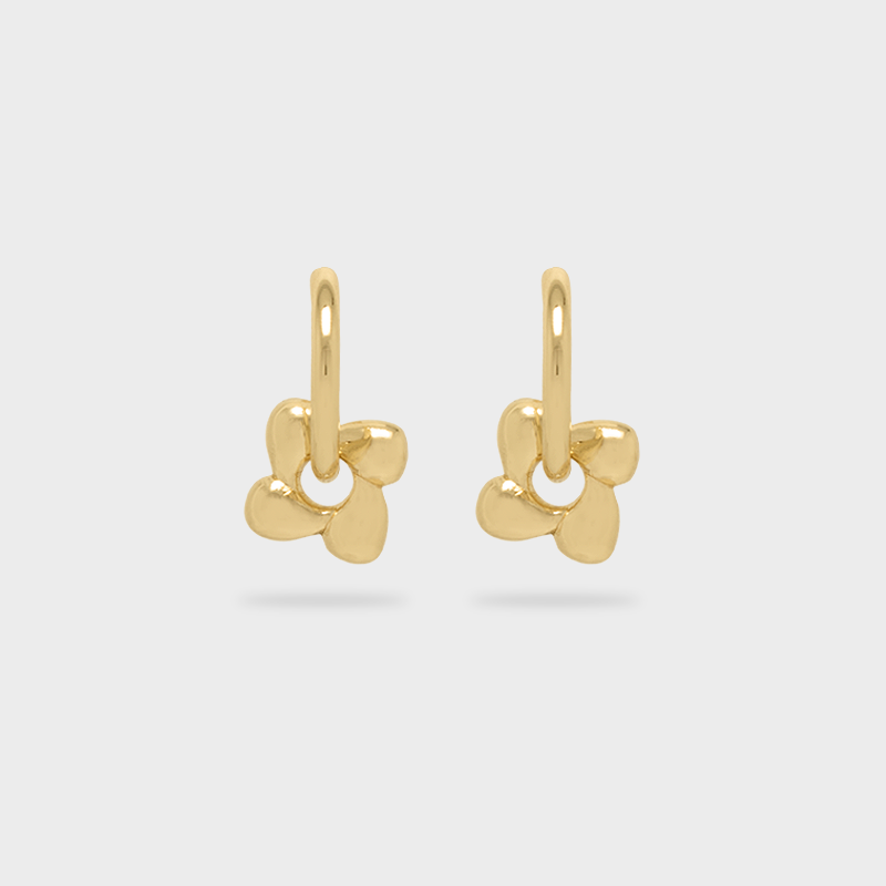 Huggies de chapa de oro con dije en forma de flor de pétalos redondeados. Un diseño femenino y moderno que añade un toque de frescura a cualquier look. Su dije removible permite usarlos también como aros simples, haciendo de esta pieza una opción versátil para el día a día.
