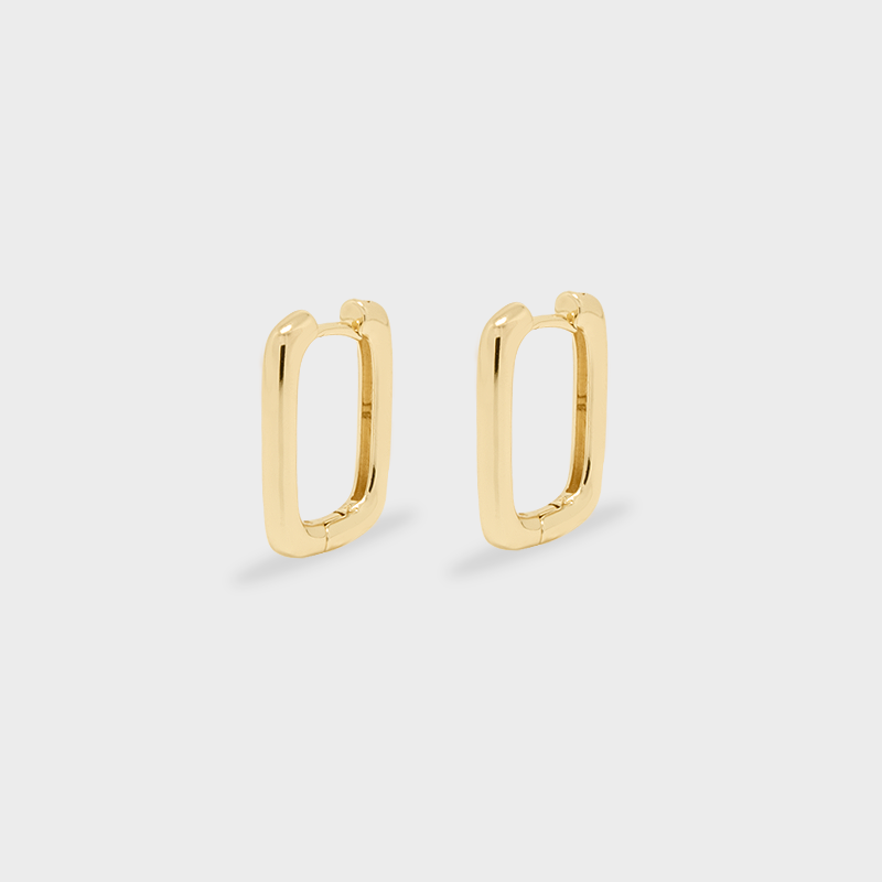 Huggies con forma rectangular y acabado pulido, un diseño contemporáneo que combina minimalismo y versatilidad. Su silueta geométrica los hace ideales para llevar solos o acompañar con otros aretes en distintas perforaciones. Elaborados en chapa de oro, son una opción moderna y atemporal para el uso diario o para complementar looks más sofisticados.