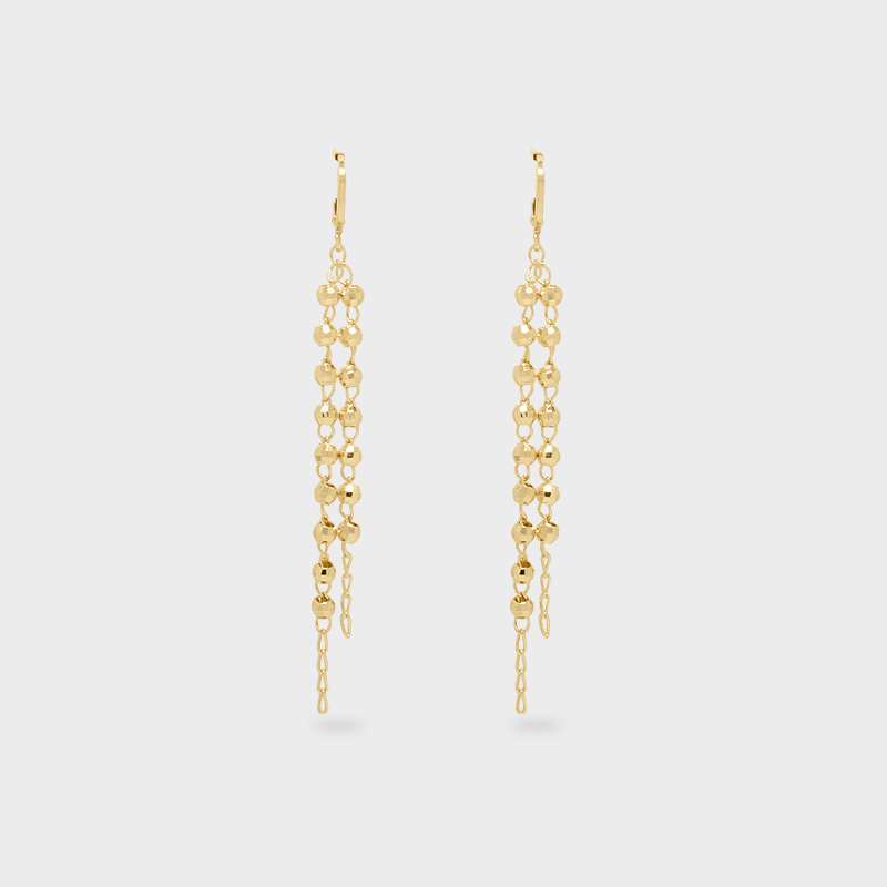 Huggies largos con un diseño fluido de pequeñas esferas enlazadas con acabado facetado que reflejan la luz con cada movimiento. Su forma alargada y liviana aporta un toque sofisticado y femenino, perfectos para una cena, un evento o para elevar un look sencillo. Elaborados en chapa de oro, destacan por su brillo sutil y elegante presencia.