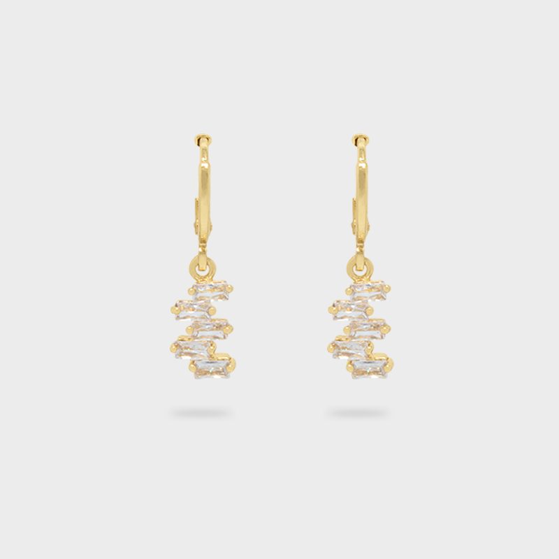 Huggies de chapa de oro con dije colgante formado por circones baguette dispuestos en forma escalonada. Su diseño geométrico refleja la luz desde distintos ángulos, creando un brillo moderno y sofisticado. Perfectos para looks de noche o para añadir un toque elegante al día a día.