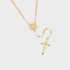 Un rosario elegante elaborado en chapa de oro, con cuentas esféricas que aportan un brillo clásico y un dije central con circones que enmarcan la medalla, añadiendo un toque sofisticado. Terminado con cruz detallada, es una pieza significativa que combina devoción y estilo atemporal.