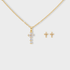Juego de acero inoxidable con baño dorado, compuesto por un collar con dije de cruz y mini aretes a juego. Ambos diseños están realzados con circones blancos que aportan un brillo delicado y elegante. Hecho en acero inoxidable, este set es resistente al agua, ideal para acompañarte en el día a día sin perder su brillo ni color.